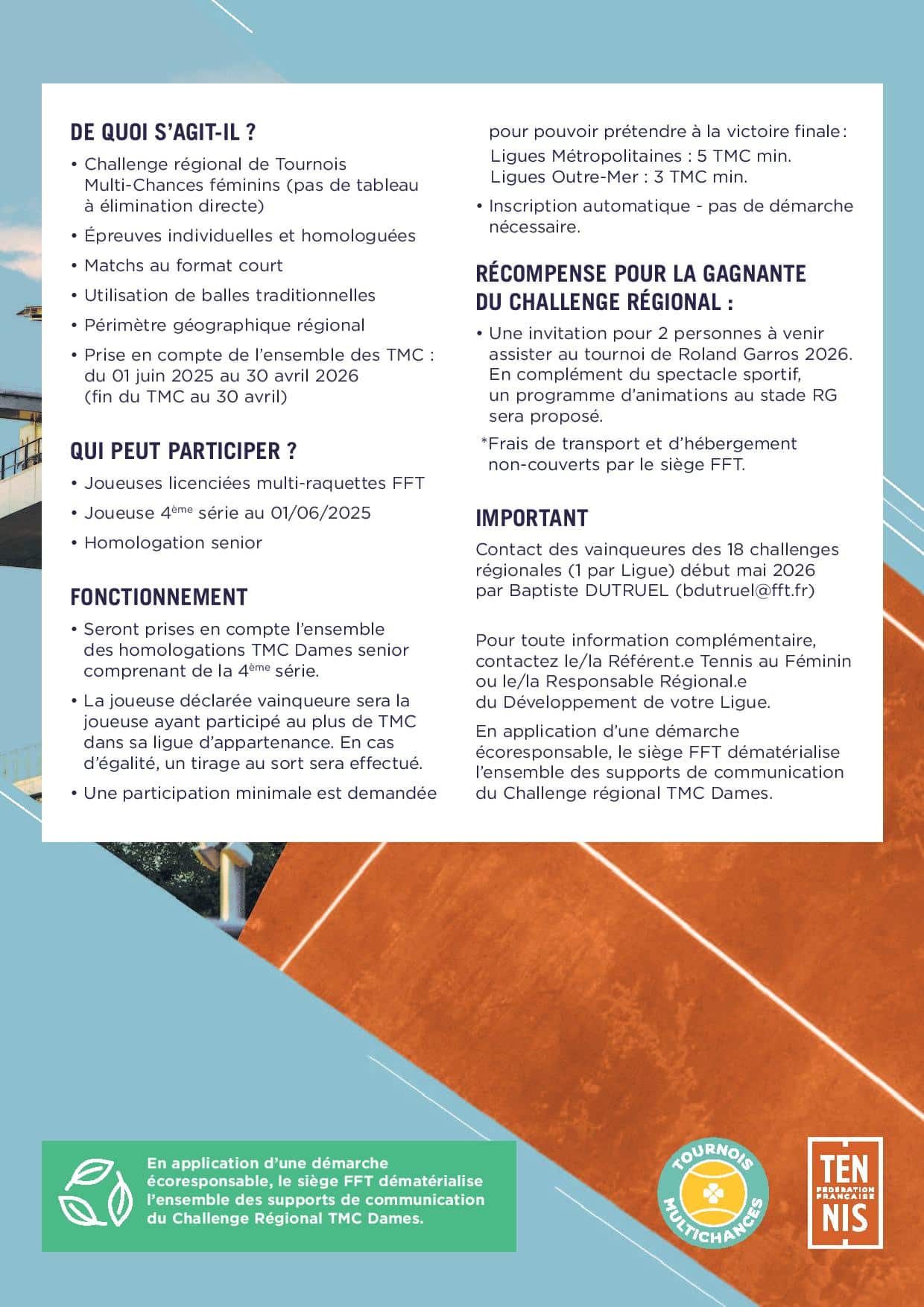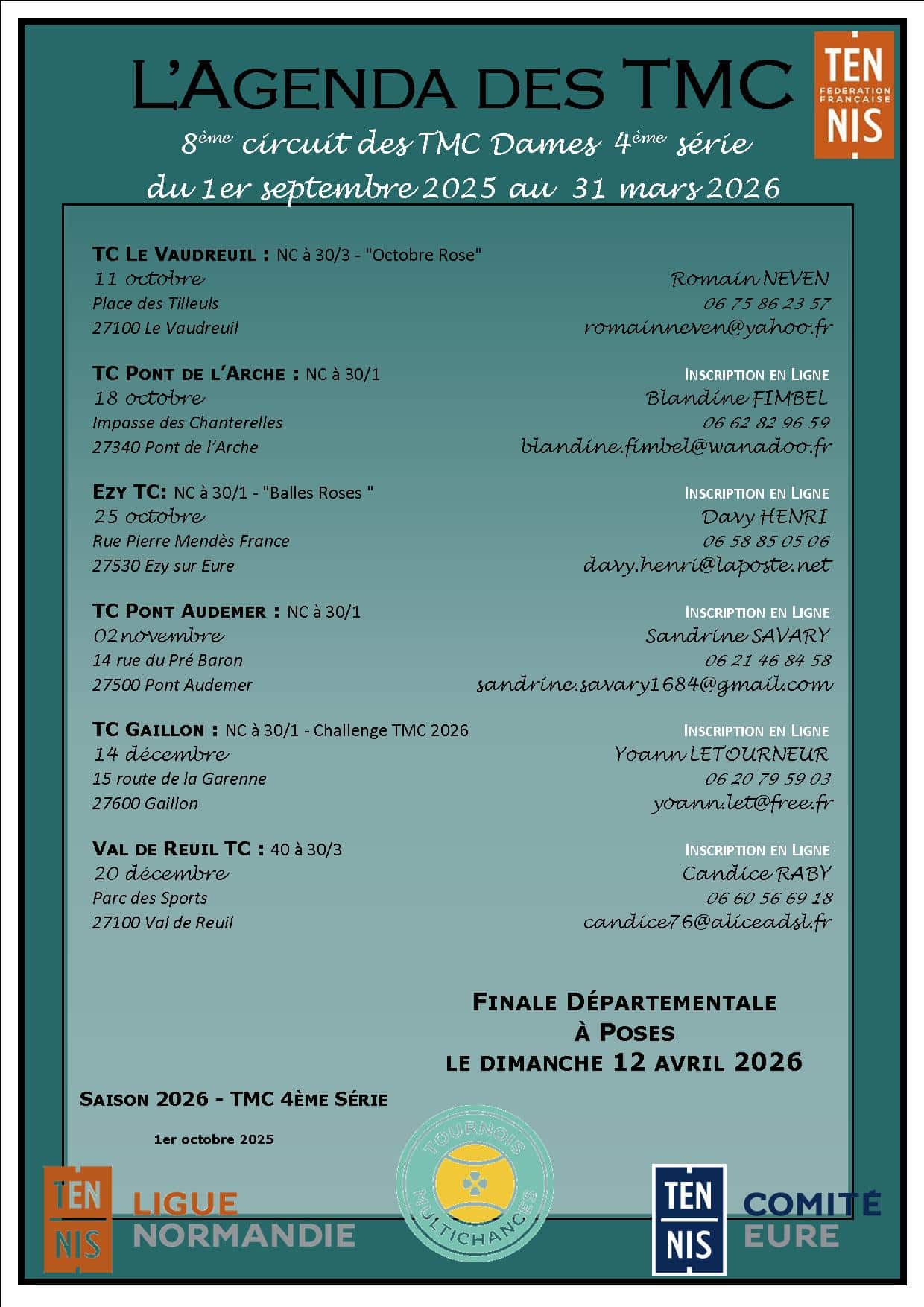 Retrouvez l’agenda du 8ème circuit des TMC Dames 4ème série pour la saison 2026.